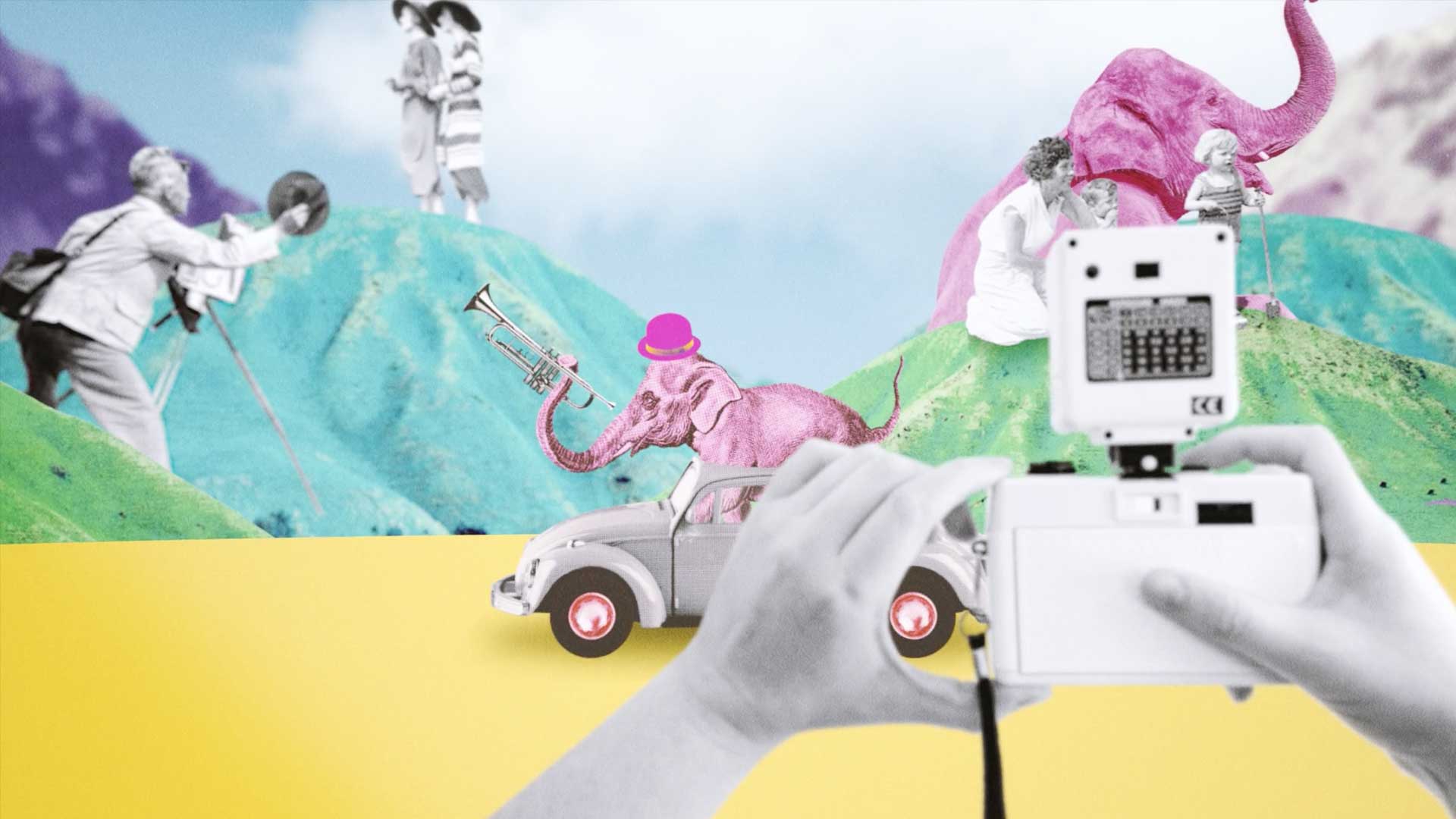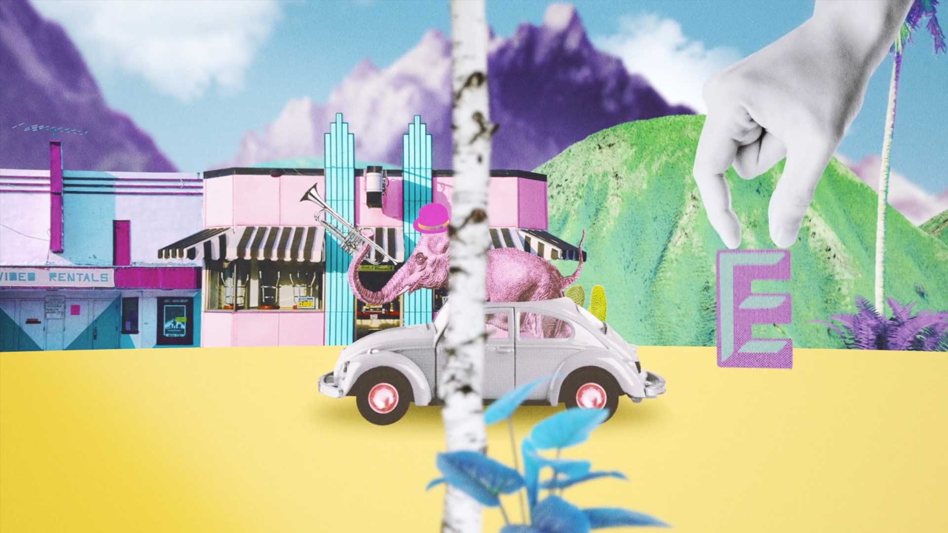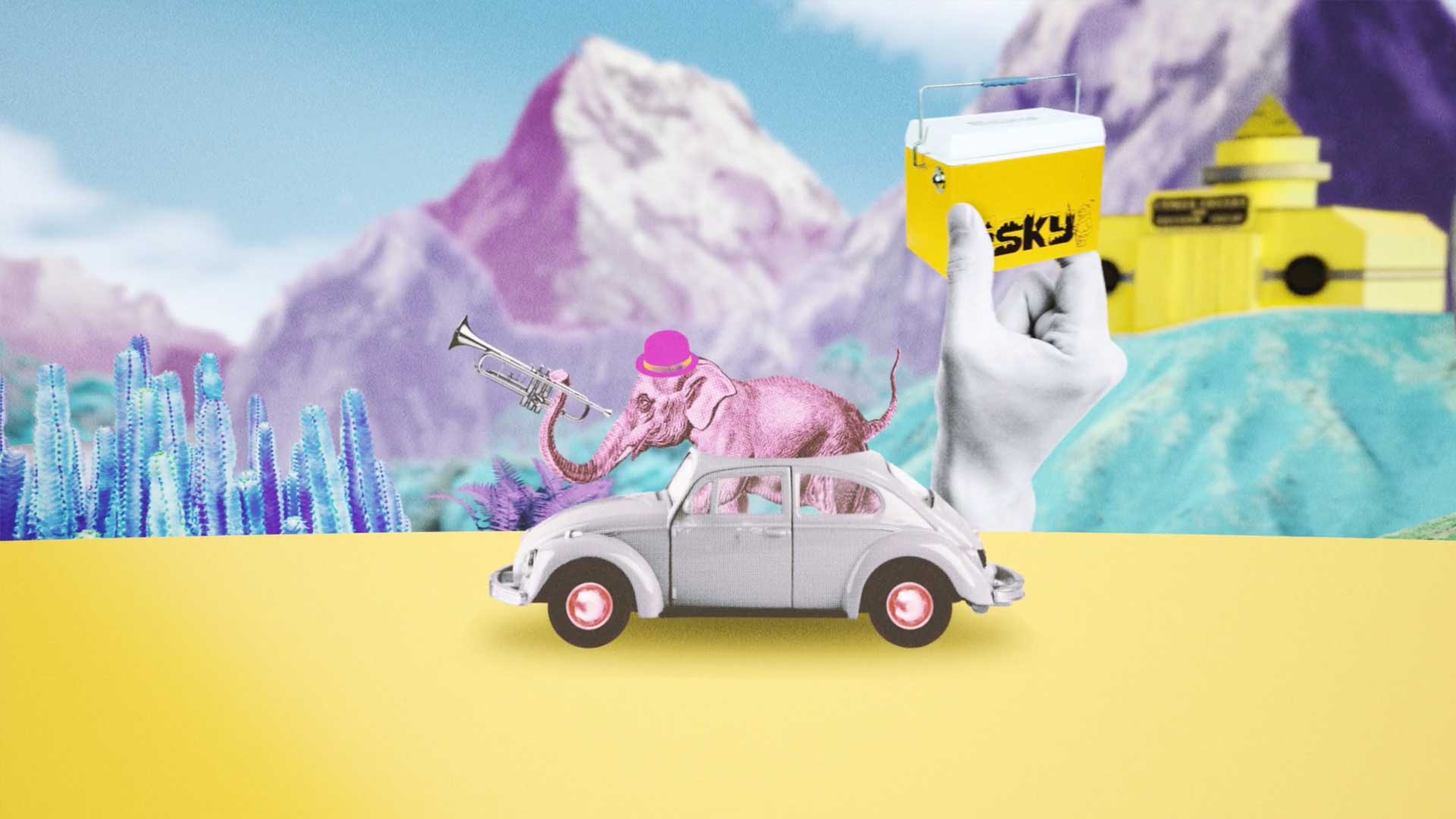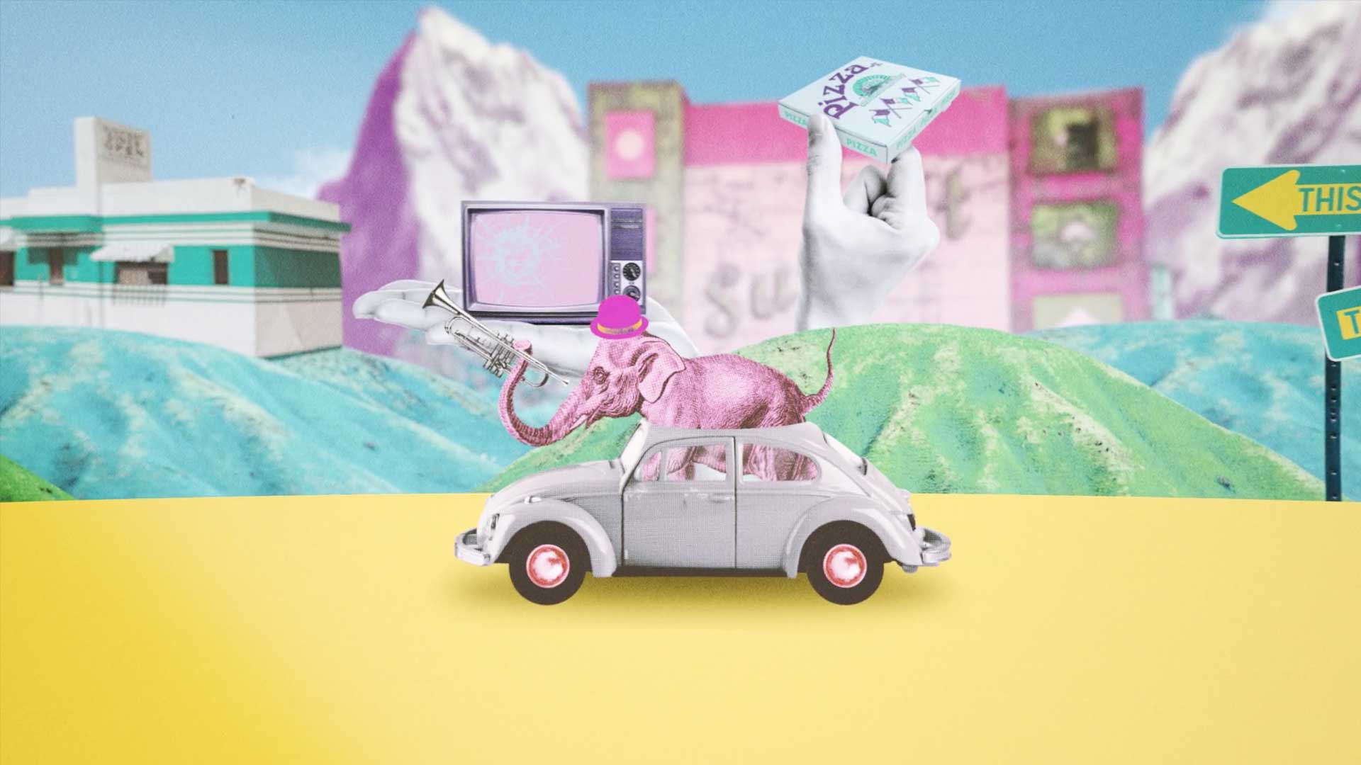 Starting in a vintage-inspired sepia lounge room, the camera pans into a TV screen, where the focus in on a pink elephant who travels through a colourful streetscape, peppered with Monty Python-esque features.